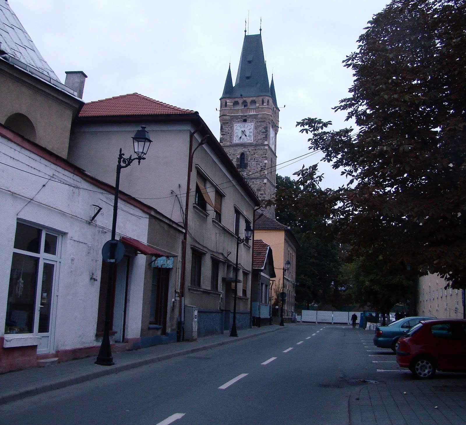 Ha a piac felől közelítünk a főtér fele, háttérben az István torony